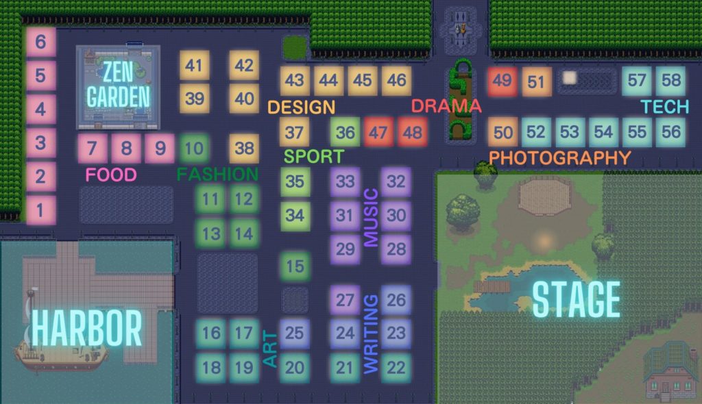 After the Gather map was created and relevant information was confirmed, the consultant started adding objects to the map. Not all objects can be found in the Gather Town default setting for the Japanese summer festival theme. The students researched what objectives would make their idea into a reality to get their idea right and passed their ideas to the consultant. The finalized map included: a Zen garden, a center for arcade machines, a place for Japanese shave ice, individualized booths for every student, a boat (as it’s a festival by the harbor) and more. A student just started to learn how to use Gather and designed each booth for every student. This was powerful learning as it indicated how students’ motivation increased when working on something they felt curious about and interested in. Students had a couple of meetings with the consultant to finalize the final map design.