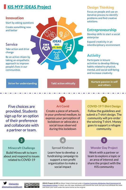 I worked collaboratively with our MYP teachers and initiated IDEAS Project and Fair last academic school year at KIS International School (Bangkok, Thailand). IDEAS represents Innovation, Design, Entrepreneurship, Activity, Service. The concept is also a continuum extending to the Creative, Activity, Service (CAS) component in the Diploma Programme.