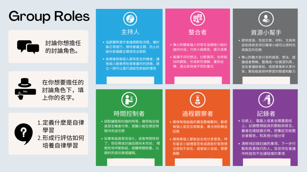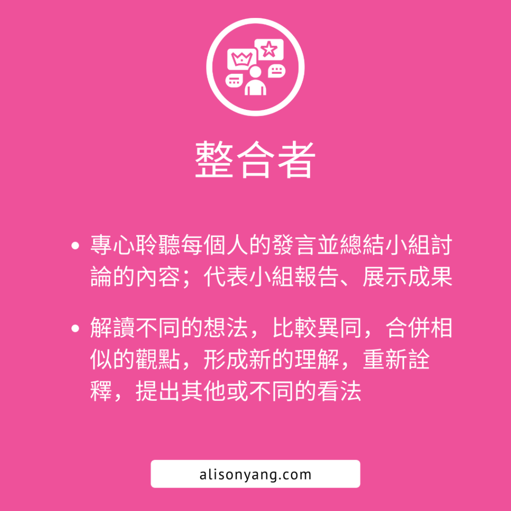 One way to facilitate communication and ensure everyone’s voice is heard in a meeting or a lesson is by assigning roles to each person in the discussion or conversation. Students should have an opportunity to experience different roles in different conversations. I also think this is how students can practice forming different identities and exploring their strengths as different roles require specific skills. Learning is a shared responsibility between the teacher and learners. Teachers can empower students by creating time and structures to guide them to share perspectives and build confidence. Most importantly, knowing the task and the role learners are required to play will reduce their anxiety and increase psychological safety in the learning environment.