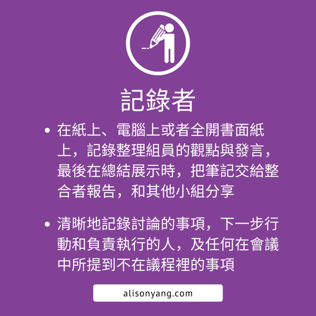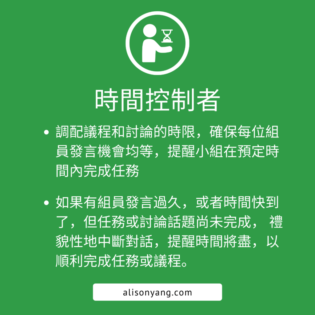 To encourage efficiency, the timekeeper stays aware of using time, how much time is assigned to each task, and how much time the team is to accomplish a specific task. The Timekeeper can cut off conversations (politely) if they’re running over their allotted time, keeping things moving along at a brisk pace.