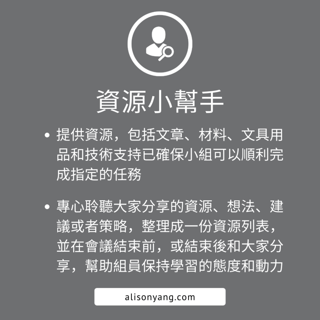 The resource manager’s role is to provide resources, including articles, supplies, and technical support, to ensure that others in a team can accomplish the task. They also listen for helpful ideas, tips and/or suggestions shared. They record a list of resources and share them with the team later.