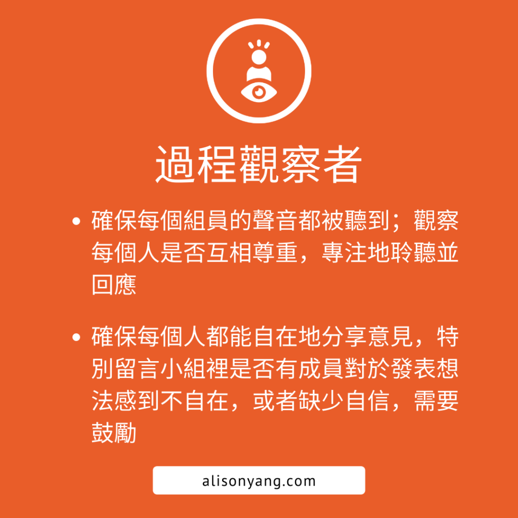 The process observer ensures all voices are heard, and everyone is respectful, attentive, and responsive to others during a conversation. They observe the group discussion to ensure everyone feels comfortable speaking up and watch out for any people who might be feeling unconfident about what they want to say. If one person dominates a conversation, they encourage others to chime in.