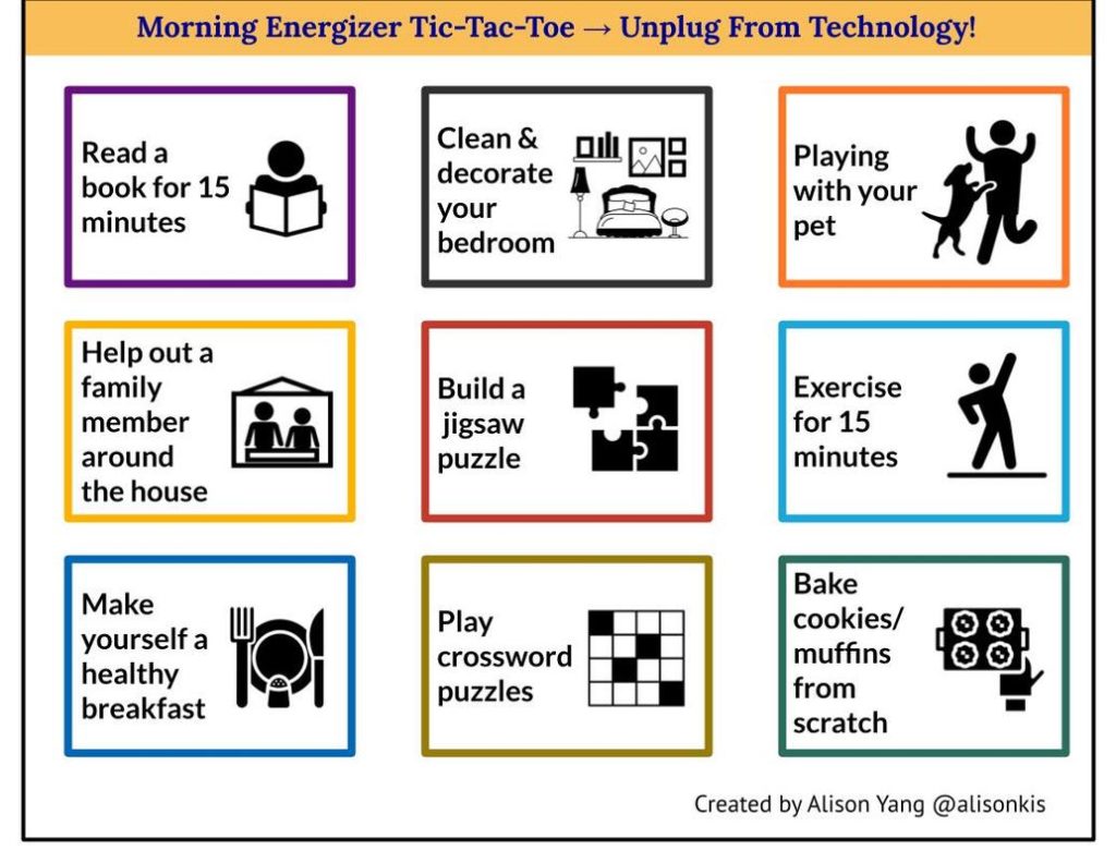 Our team also wants to encourage students to unplug from technology a bit in the last week of school. Therefore, we have put together some activities for students as the morning energizers. Students can choose any activity from the tic-tac-toe menu or, of course, do something they like (or even sleep in a little bit!)