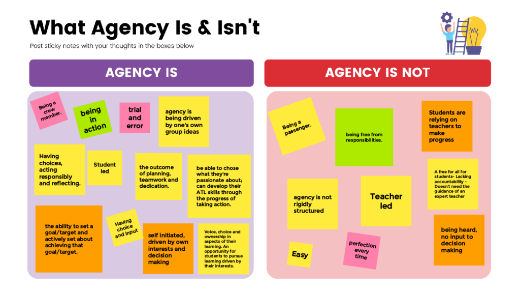 To begin the entrepreneur project, the first step was to clarify what agency is and isn’t with teachers. Before our first meeting, I invited participating teachers to brainstorm what agency is and isn’t via Jamboard. This is to ensure we all have a shared understanding of student agency and how we define it. Having some common understanding of agency, we were able to move forward with our project and guide our students. In my blog post, “Debunk Myths of Student Agency“, I explored what student agency is and isn’t, and how teachers could create environments that foster student agency.
